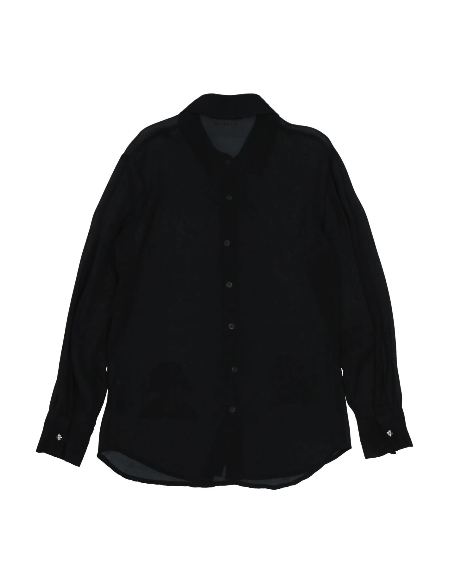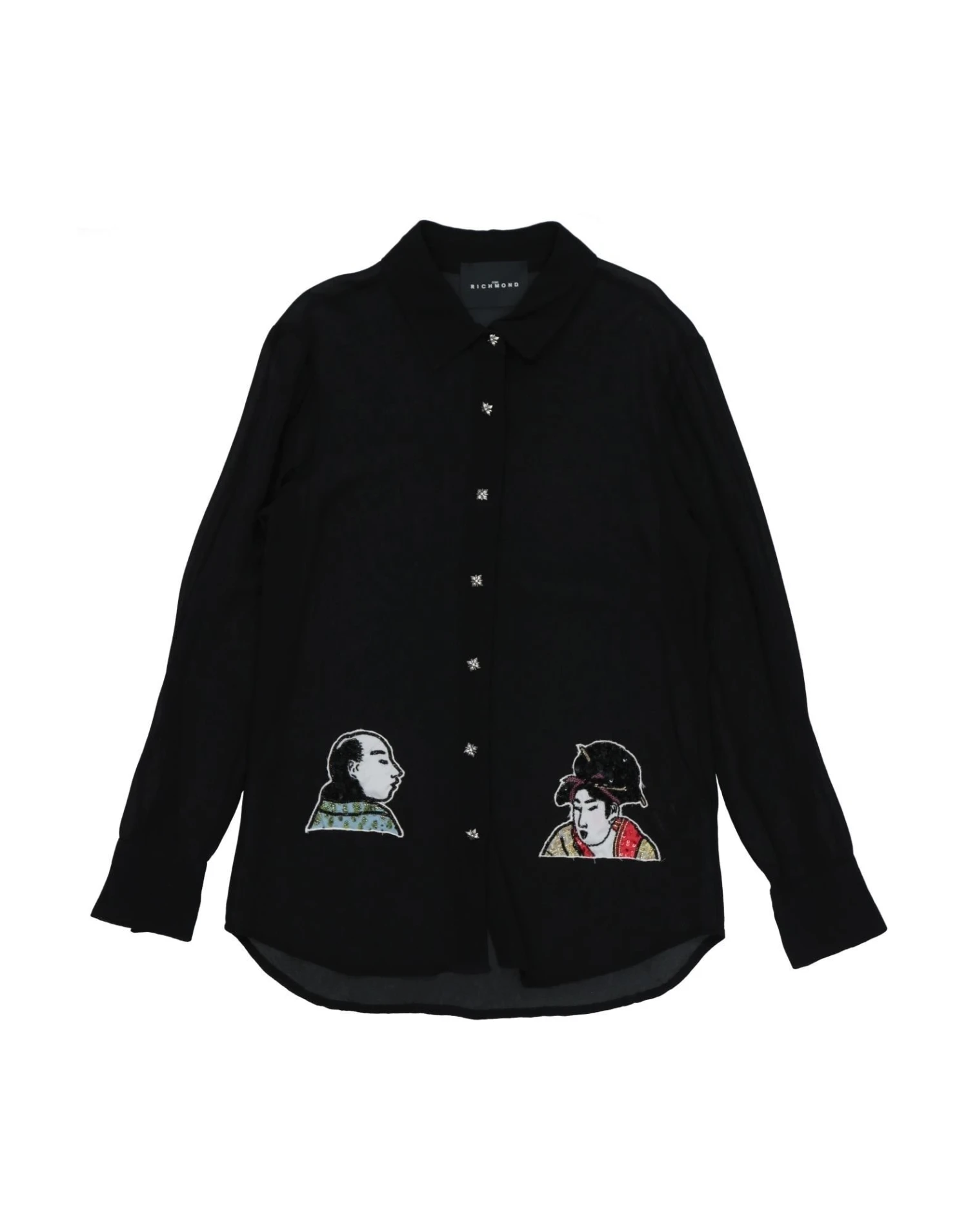 Krepp, Perlen, Kontrastapplikationen, Einfarbig mit Applikationen, Klassischer Kragen, lange Ärmel, Druckknöpfe, ohne Taschen, mit 30° waschen, chemische Reinigung nicht möglich, waschen mit Bleichmittel möglich, Trockner ungeeignet, mit Max 110° bügeln, Manschetten mit Druckknöpfen