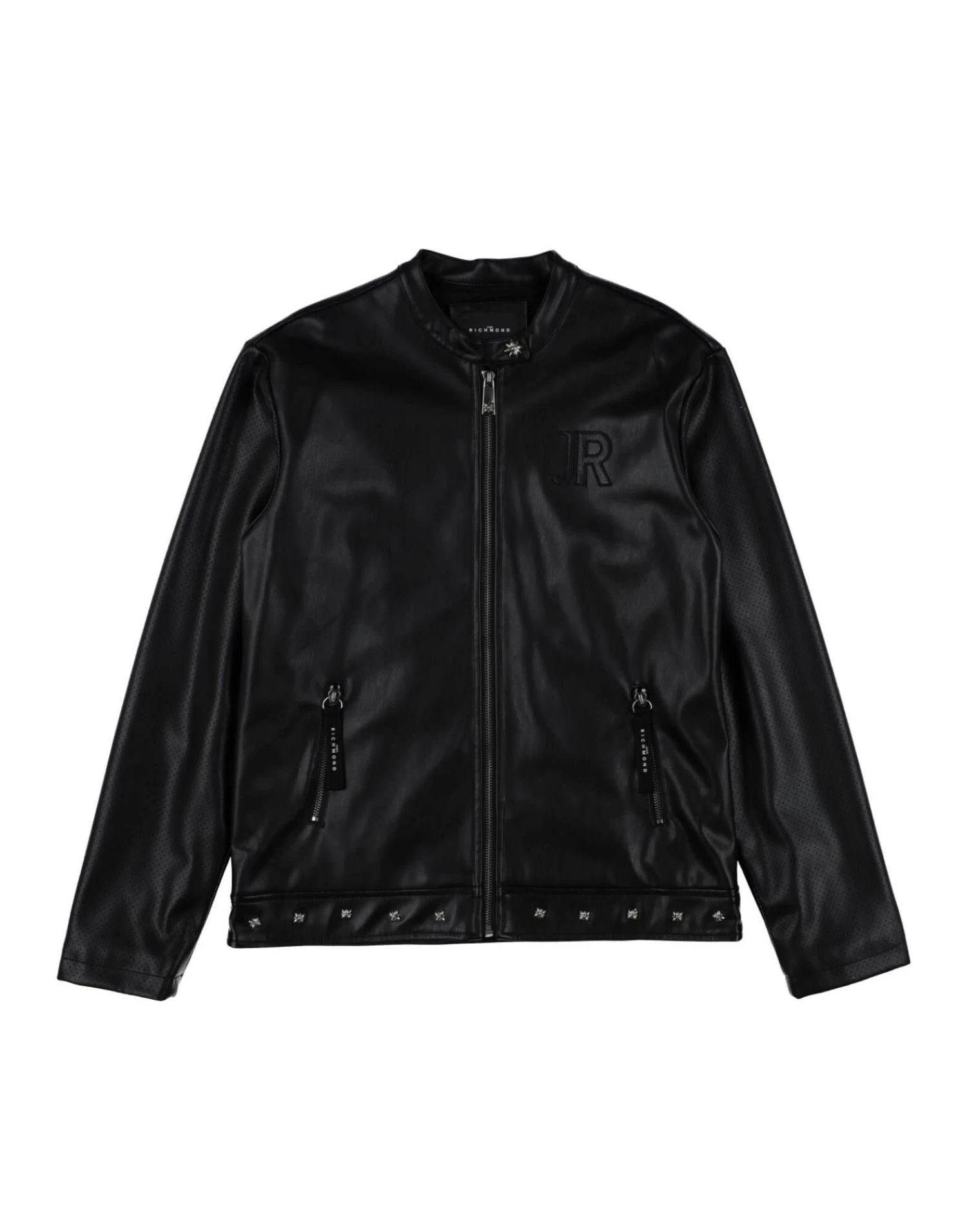 nicht mit Wasser waschen, chemische Reinigung möglich, nicht Bleichen, Trockner ungeeignet, nicht bügeln, Kunstleder, Metallapplikationen, Brand Logo, Einfarbig mit Applikationen, chinesischer Kragen, Einreiher, lange Ärmel, Manschetten mit Reißverschluss, gefüttert, Druckknöpfe, Reißverschluss, viele Taschen, Tasche mit Reißverschluss, eng geschnitten