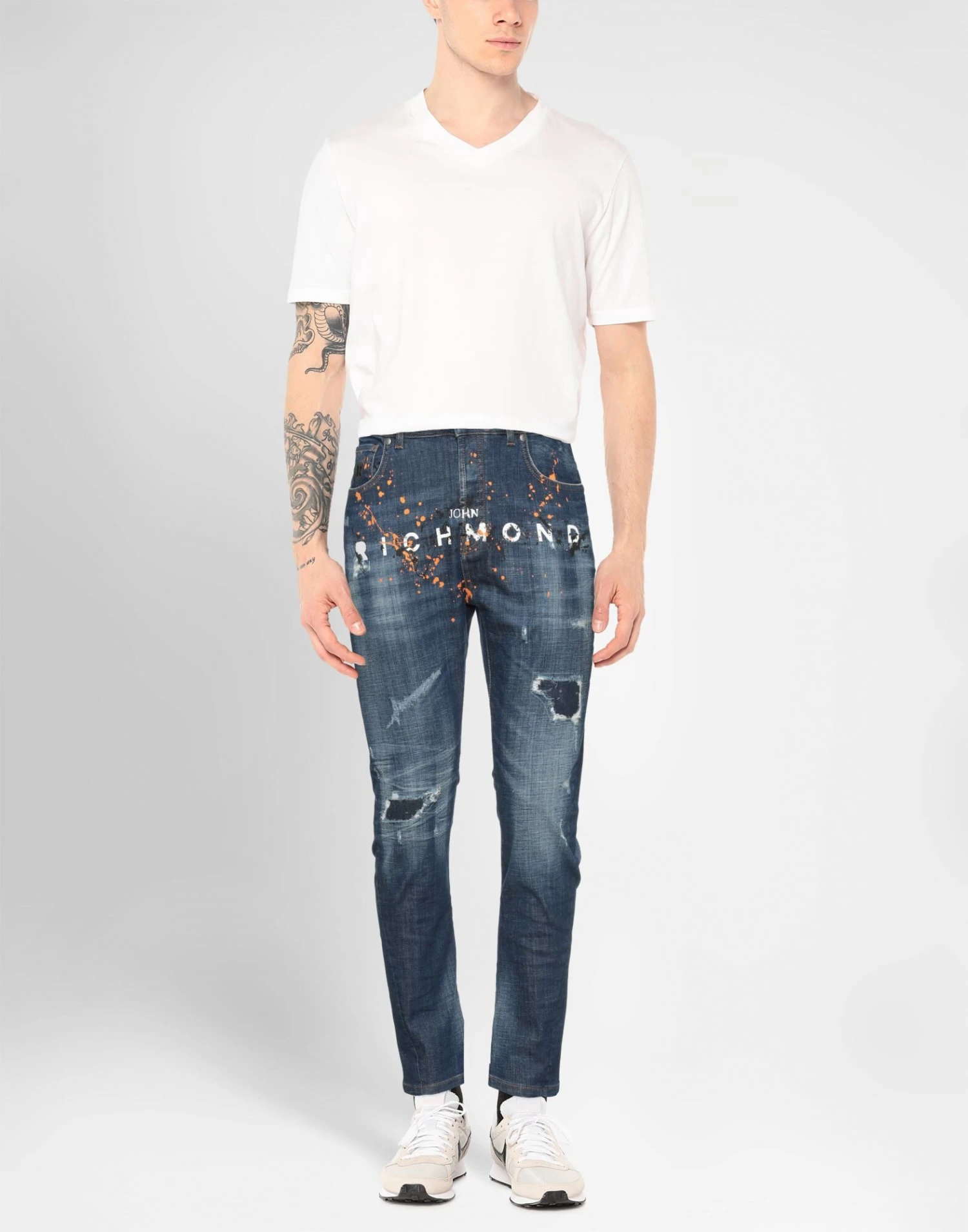 Denim, Délavé-Effekt, Destroyed-Look, Brand Logo, Lederapplikationen, Einfarbig mit Print, Mittlere Waschung, hohe Taille, Karottenschnitt, Regular fit, Knöpfe, Fünf Taschen, Enthält nichttextile Teile tierischen Ursprungs.