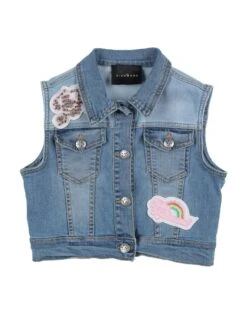 Denim, Délavé-Effekt, Brand Logo, Einfarbig mit Applikationen, Mittlere Waschung, Klassischer Kragen, Einreiher, ärmellos, ungefüttert, Knöpfe, viele Taschen, Stretch, Handwäsche, chemische Reinigung nicht möglich, nicht Bleichen, Trockner ungeeignet, mit Max 110° bügeln, eng geschnitten