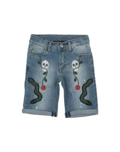 Denim, Used-Look, Délavé-Effekt, Stickerei, einfarbig, Dark Wash, normale Taille, vorderseitiger Verschluss, Knopf- und Reißverschluss, viele Taschen, Stretch, weit geschnitten