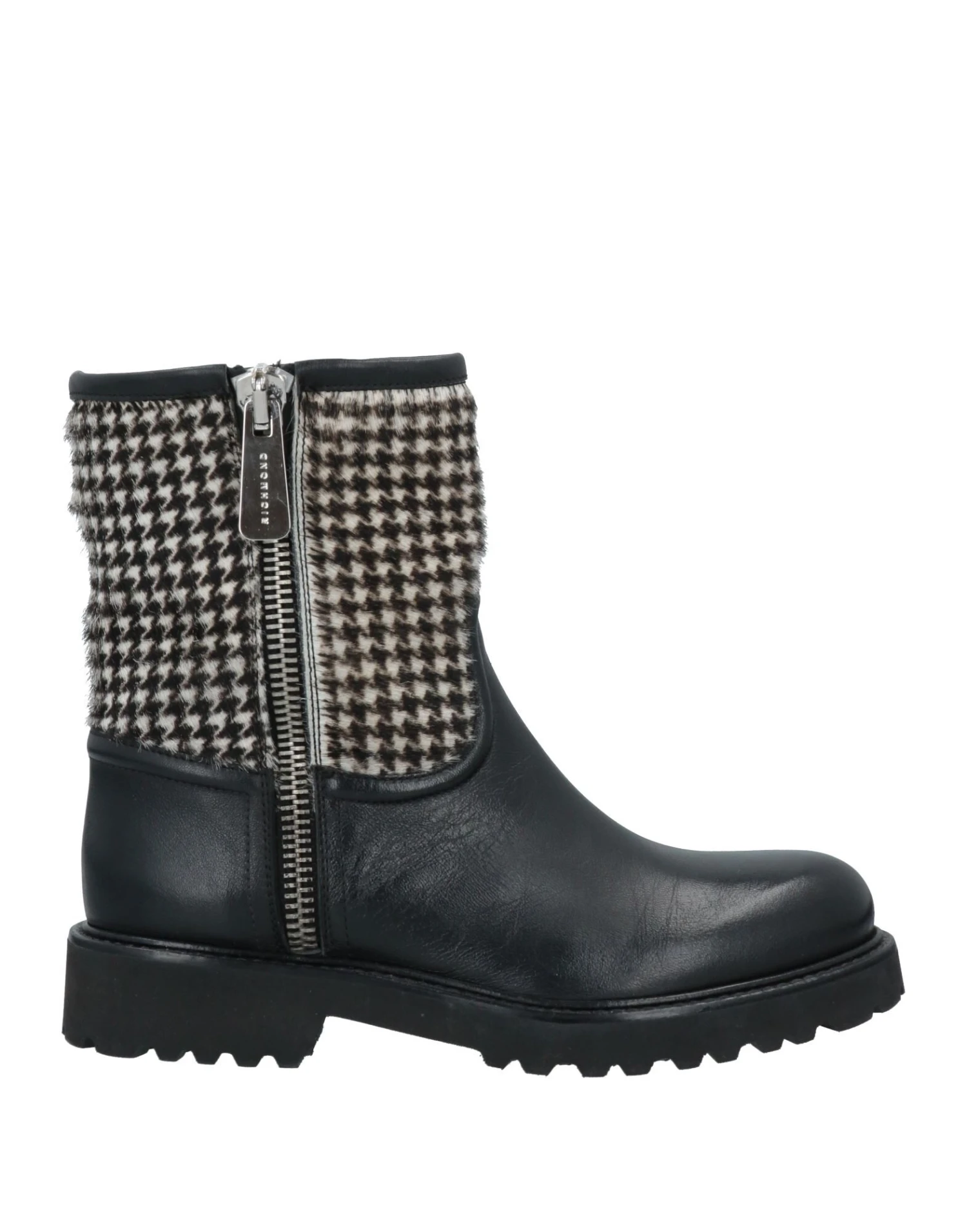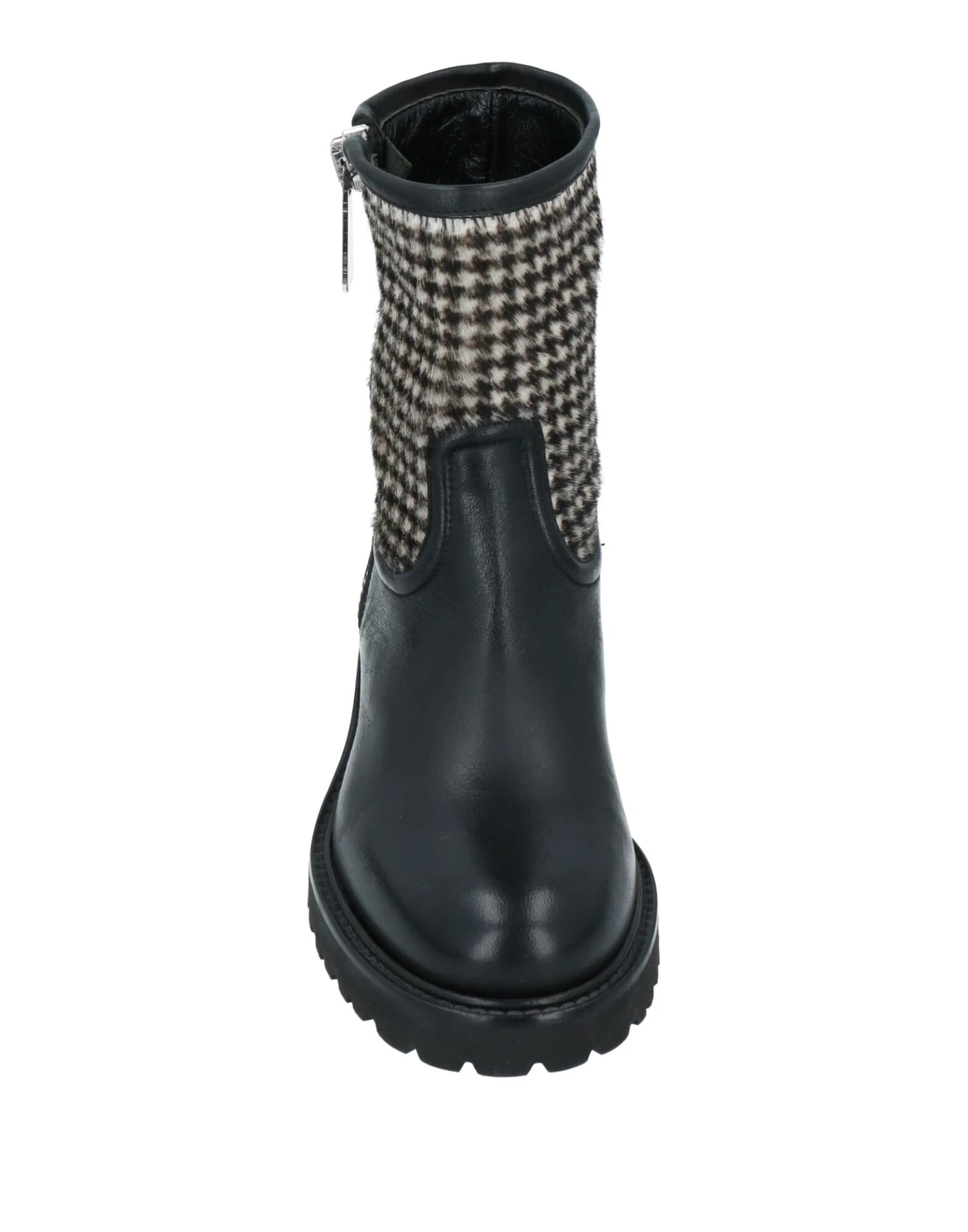 Leder, Kalbsfell in Ponyfell-Optik, ohne Applikationen, Hahnentritt, Rückseite aus Leder, Reißverschluss, runde Spitze, Blockabsatz, robuste Sohle, Enthält nichttextile Teile tierischen Ursprungs.