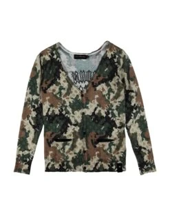 Handgestrickt, Leichter Strick, Stickerei, Brand Logo, Camouflagemuster, V-Ausschnitt, lange Ärmel, Knöpfe, viele Taschen, Handwäsche, chemische Reinigung nicht möglich, nicht Bleichen, Trockner ungeeignet, nicht bügeln, Stretch, eng geschnitten